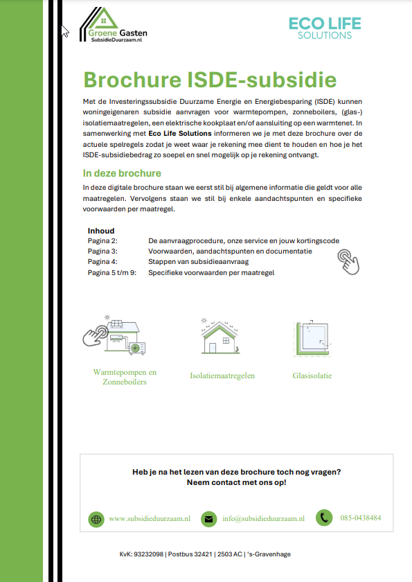 Met deze brochure krijg je een duidelijk overzicht van hoe je subsidies kunt aanvragen voor warmtepompen, zonnepanelen, isolatiemaatregelen, en meer. Ontdek stap voor stap wat er nodig is om de ISDE-subsidie soepel en efficiënt aan te vragen.